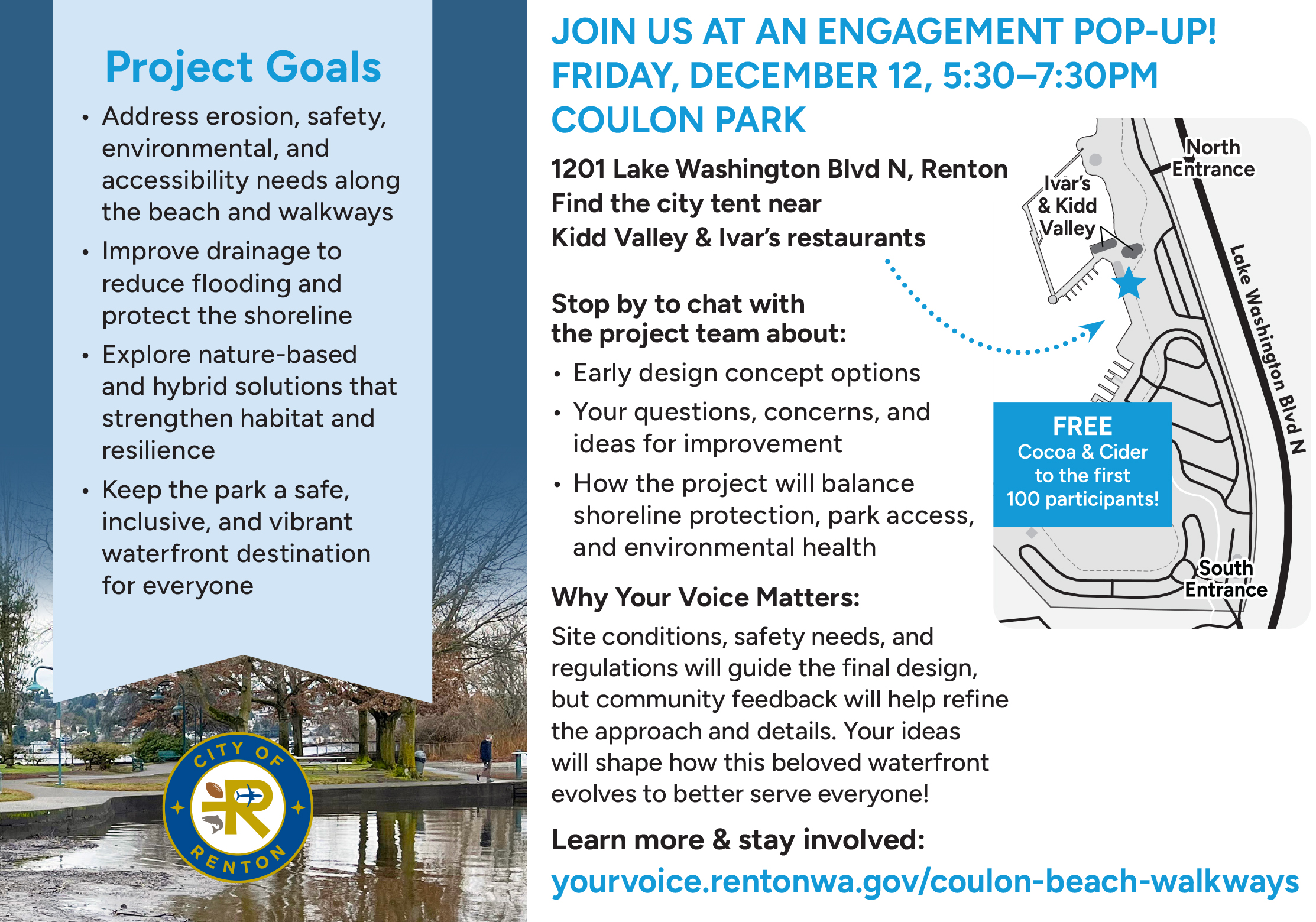 Community engagement is now underway, including our first in-person event on Friday, December 12th from 5:30–7:30 p.m., along with opportunities to comment through our online survey, now open below.