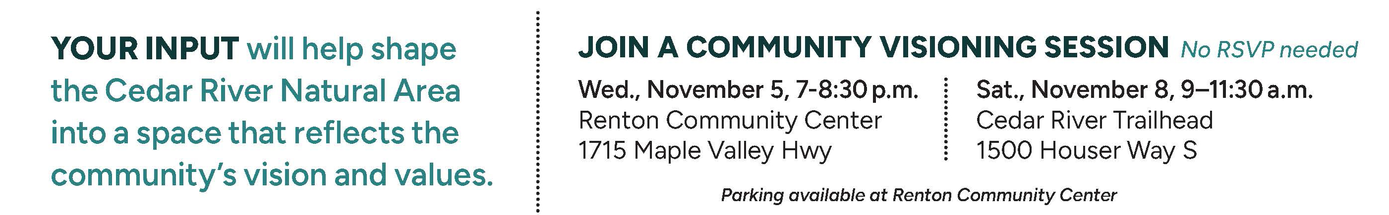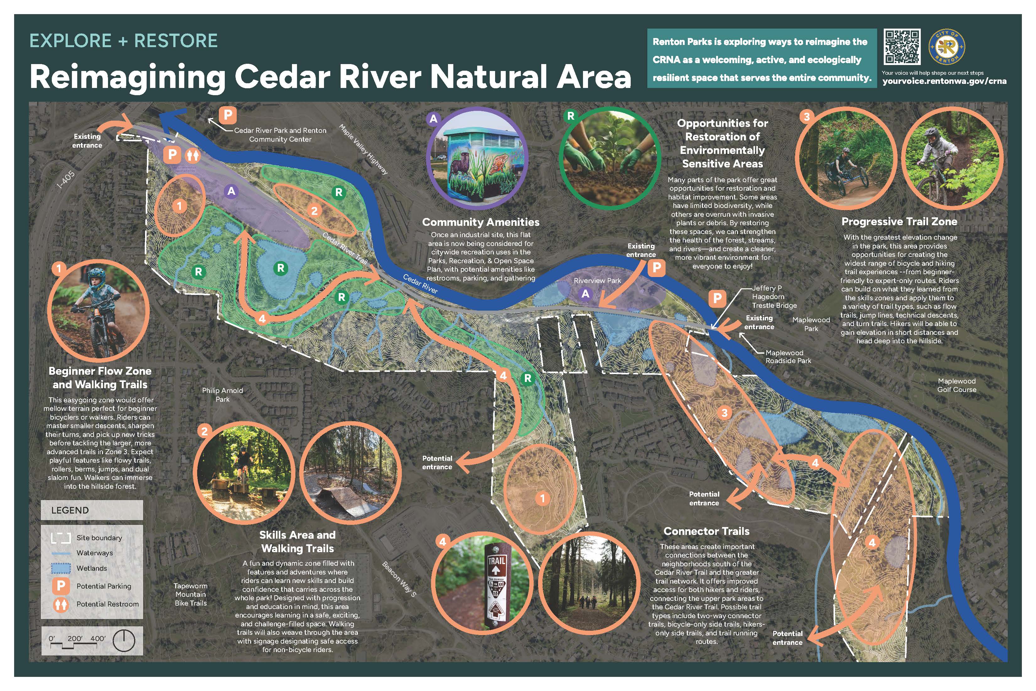 In partnership with Facet Landscape Architects and the Evergreen Mountain Bike Alliance, the City’s Parks and Recreation Department is exploring ways to restore and reimagine the Cedar River Natural Area as a welcoming, active, and ecologically resilient space that serves the entire community.
